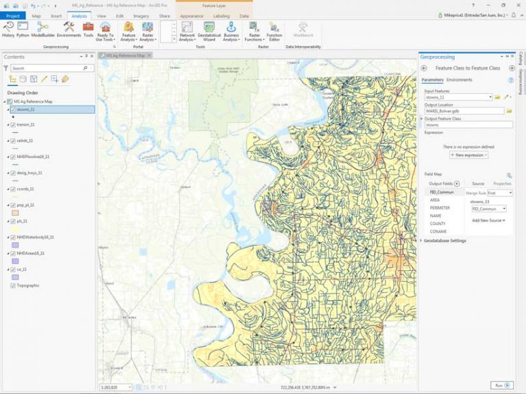 Repeat this same process to export the other 10 Bolivar County shapefiles. Check the Output Coordinate System on the Environments tab to ensure it is set to WGS_1984_UTM_Zone_15N and the Extent is set to As Specified Below. Remember to exactly copy the source name, without its FIPS code (_11), as the name for each new feature class. Remove the shapefile and new feature class from the Contents pane after processing each shapefile.