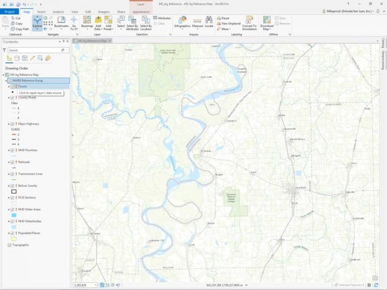 Now it’s time for the fun part—applying symbology. In the LYRFiles folder, a single layer file, MARIS ReferenceGroup, will reload all 11 grouped Bolivar County feature datasets in the order shown, with standard symbology and some labels. By pointing each feature class to its appropriate dataset, you can use this layer file to load MARIS data for any county. [Learn more about creating and using layer files in ArcGIS Pro.]