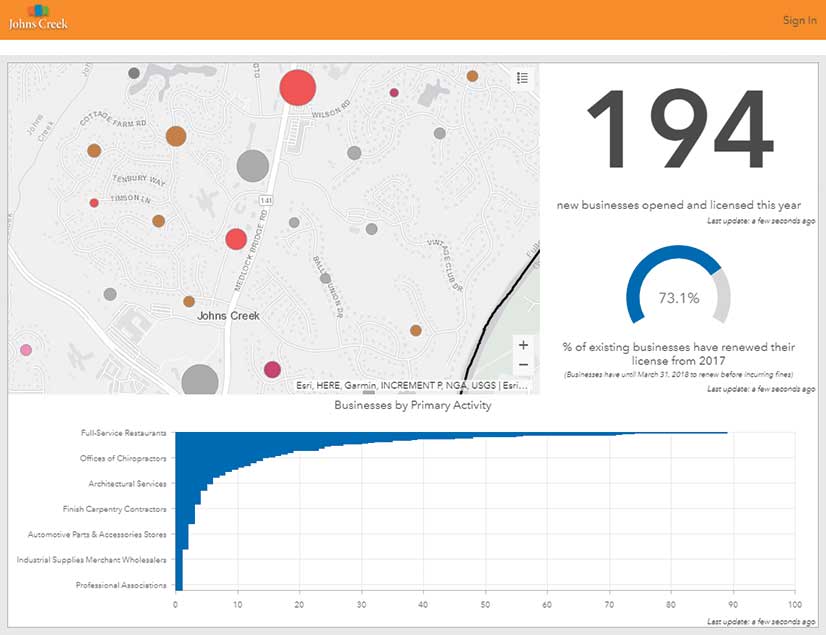 The city motto is “Be the Exception.” Johns Creek has an exceptionally large entrepreneurial population—half the city’s licensed businesses are home based. It is a constituency that expects its city to be responsive and efficient. From its inception, Johns Creek has relied on technology, including GIS, to deliver a high level of service to citizens.