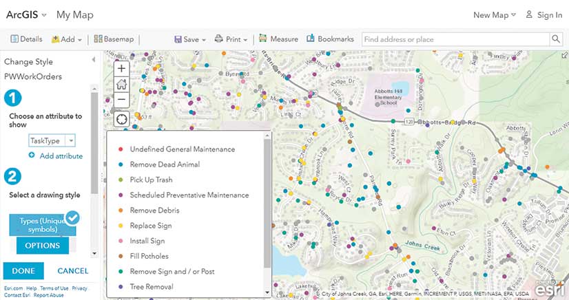 Getting city data into the popular Waze app, rather than replicating its functionality in its own road closure app, lets Johns Creek amplify its road work notifications while alerting city staff to traffic congestion and other issues in real time. Johns Creek uses ArcGIS Online to share its data with Waze, and ArcGIS GeoEvent Server to pull data back from Waze into its system and make it actionable. An added benefit from this approach: Instead of reinventing Waze and other popular apps, the GIS department can concentrate on apps and data products that don’t exist and could benefit the city.