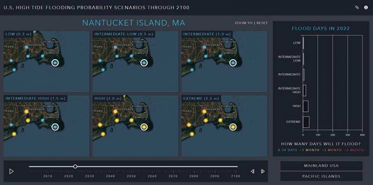 U.S. High Tide Flooding app allows quick visualization and understanding of US high tide flooding probability scenarios through 2100. Users can quickly assess how many flooding days are expected to occur within coastal communities each year for the different flooding scenarios, ranging from low to extreme. Coastal planners, state and local municipal leaders, regional planning councils, and alike need this information to better understand potential impacts to help plan accordingly. Increasing this understanding can help impact policy and protect the investments of citizens.