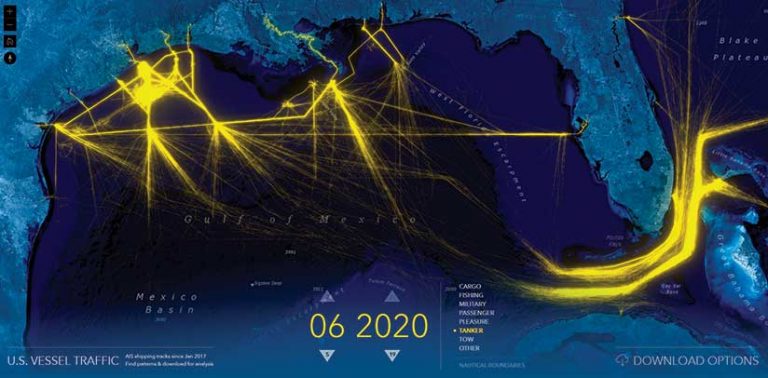 This web app was built with ArcGIS API for JavaScript as a simple tool for visualizing and accessing the nautical transportation and commerce data provided by the Automatic Identification System (AIS). Transmissions collected by the US Coast Guard (USCG) from onboard navigation safety devices, AIS data provides the characteristics and current locations of vessels in US and international waters for safe navigation and collision avoidance purposes. This massive data source is provided by the USCG, NOAA, and the Bureau of Ocean Energy Management (BOEM) through Marine Cadastre, an integrated marine information system.