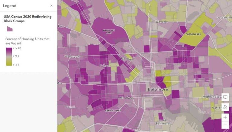 Blur is the perfect effect for data that has been protected with differential privacy. Blur provides a visual cue to anyone reading your map that things aren’t accurate at the individual block, block group, or even tract level. Figure 1 is a map of housing vacancy rates at the block group level in Baltimore, and the blur effect was not applied.