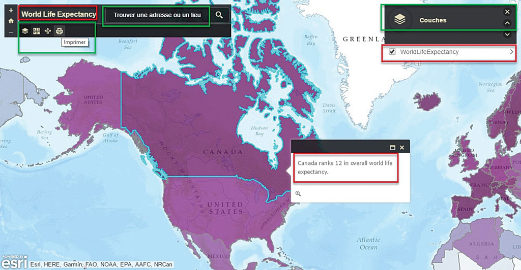 The first example uses the Basic Viewer template to showcase a map. For this project, the target audience has both French and English speakers. After the initial map and app were created, the map’s pop-up is configured with custom attributes that explain the data.