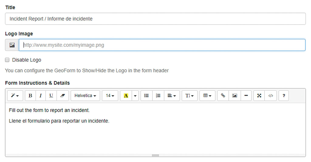 During the configuration process, you can assign a title and short instructions in both languages. In most cases, you should adjust the layer names in the web map, but GeoForm allows you to change the field name labels in the builder. This is a simple way to add a second language to the field name.