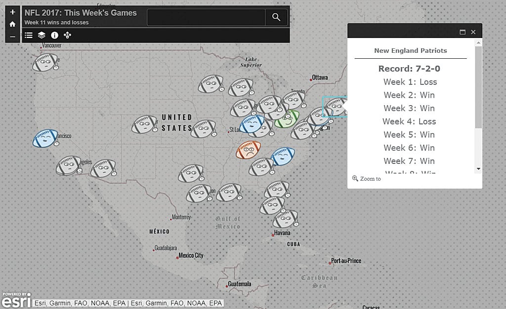 An example of animated GIFs in action is the map I created showing the wins and losses of NFL teams in 2017. The football symbols show week-by-week wins and losses for each NFL team. Winning teams smile with pride, losing teams cry with shame, and teams with bye weeks rest.