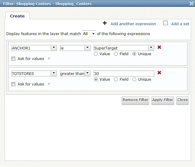 You can create more than one filter for a layer. You can create filters with multiple expressions. For example, a filter for school data might specify that Type is Elementary and enrollment is greater than or equal to 400. If you are using more than one expression, specify that matches to all or any of the expressions will be displayed. All means all criteria must be true for features to be displayed. Any means that only one expression must be true for features to be displayed.