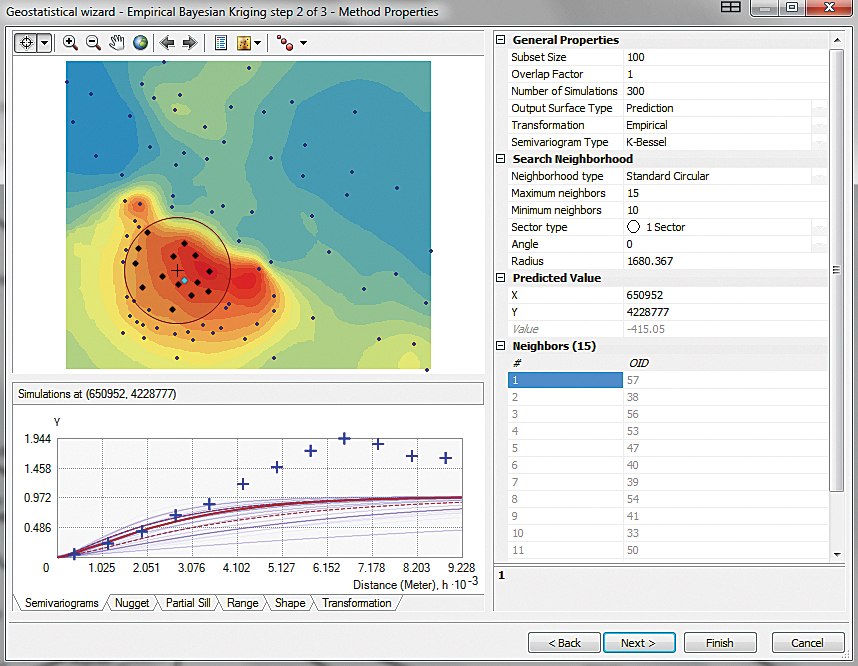 4. Move the selection circle through the model by clicking the crosshair on various points and inspect predicted values. The default search radius or Bandwidth is now nearly 2,700 meters. Click Next.