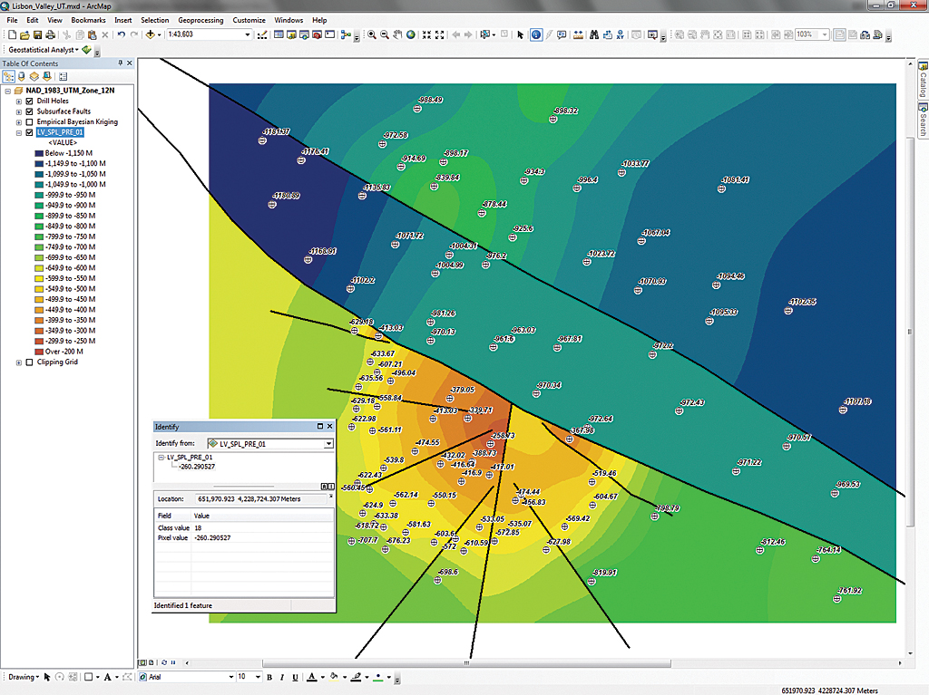Lisbon_Valley_UT.mxd initially shows the locations of drill holes and subsurface faults.