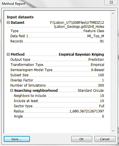 6. Click the Save button and save the model summary as an XML file called Kernel Smoothing in the Results folder in the Lisbon_Geology.gdb. Click OK.