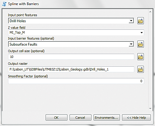 - In the tool, select Drill Holes as the Input point features and select MI_Top_M as the Z value. Choose Load Subsurface Faults as the Input barrier features, leave Output cell size as 10, and Smoothing as 0. Save the output raster in \Lisbon_Geology.gdb as LV_SPL_PRE_01. Click OK.