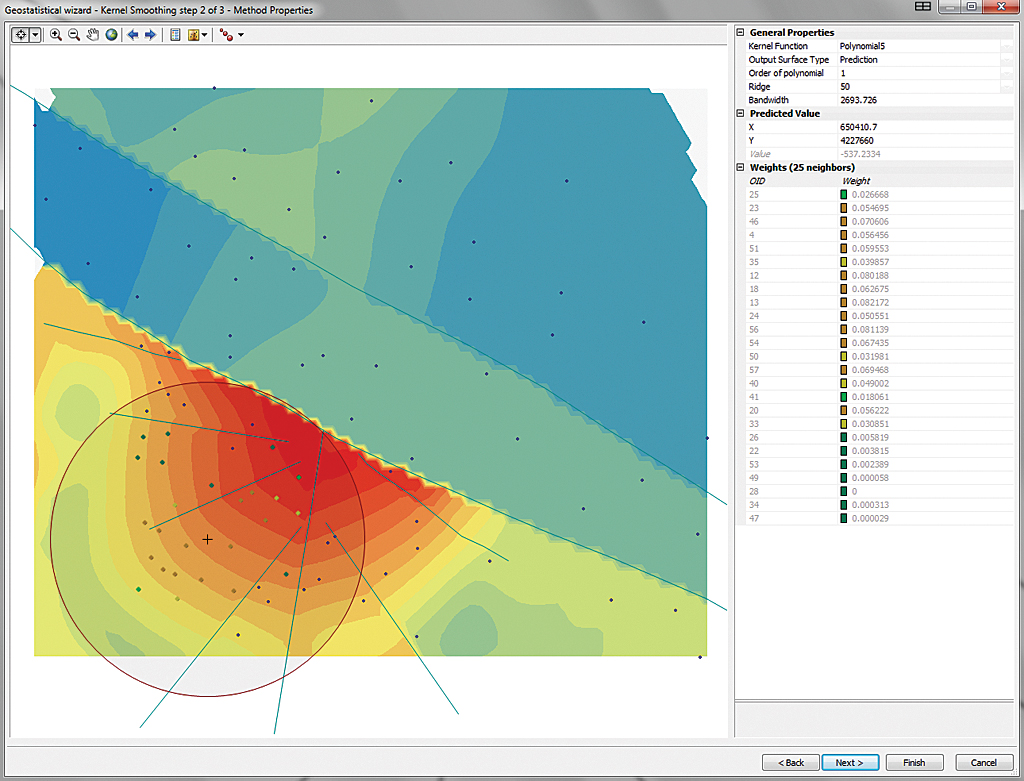 - Move the selection circle through the model by clicking the crosshair on various points and inspect predicted values. The default search radius or Bandwidth is now nearly 2,700 meters. Click Next.
