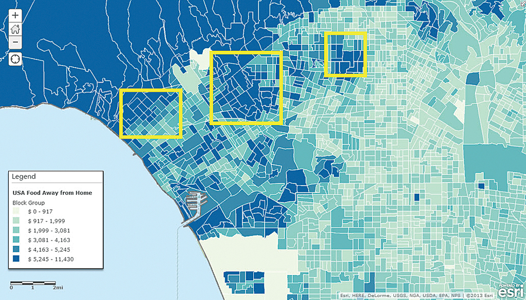 Esri Consumer Spending data for Food Away from Home in Los Angeles County was used to identify three target areas.