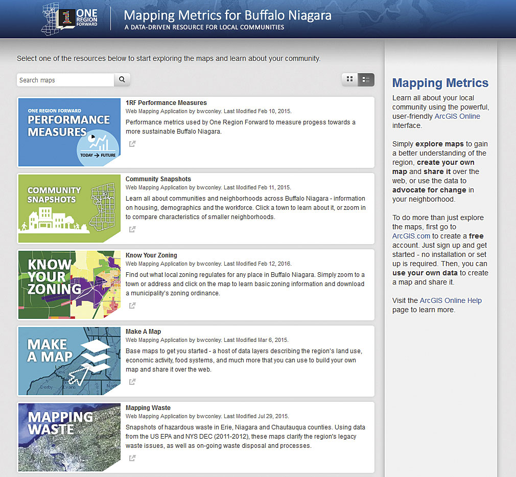 The One Region Forward team created mapping metrics for Buffalo Niagara using the Public Gallery app that comes with ArcGIS Online. The One Region Forward app makes all the data and maps about Buffalo Niagara that the team created over three years accessible from one easy-to-use interface.