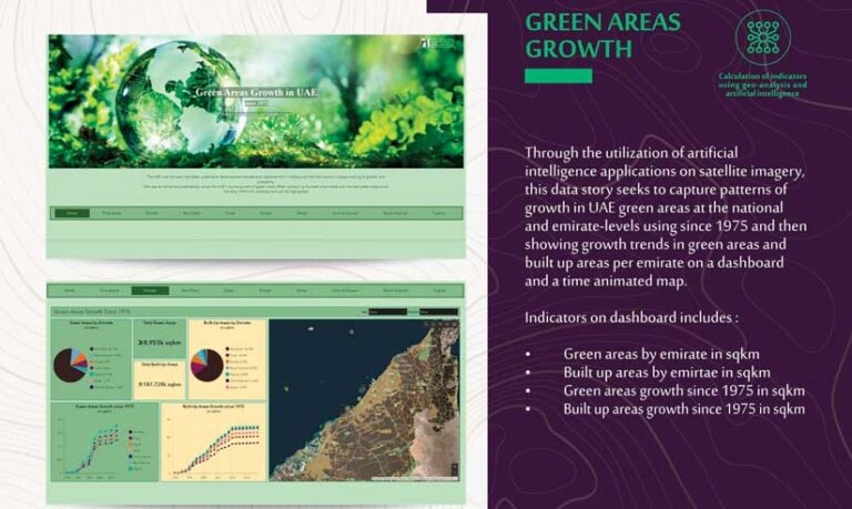 FCSC utilized Landsat imagery and National Aeronautics and Space Administration (NASA) night light imagery to monitor the growth of various areas since 1972. Historical Landsat imagery and imagery from the UAE’s Mohammed Bin Rashid Space Centre (MBRSC) helped track changes in green and built-up areas, and the rate of land consumption. NASA night light maps were used to monitor the expansion of night light from 2010. These geospatial visualization capabilities allowed us to understand space-time factors and historical trends related to population, land-use, and economic patterns. Such information is crucial for planning sustainable cities, combating climate change, and protecting terrestrial ecosystems in alignment with the SDGs. (See the UAE 50 Years of Prosperity webpage.) This project aligns with SDG 11: Sustainable Cities and Communities, particularly Target 11.3, which focuses on enhancing inclusive and sustainable urbanization.