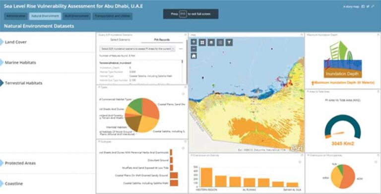 In my master’s degree thesis at Lund University in Sweden, I undertook a study on sea level rise to gauge the vulnerability of coastal cities. A key output of this thesis was a dashboard that effectively organized, summarized, and presented the results of the assessment. The dashboard underscored the vulnerability of Abu Dhabi’s natural and built environment to long-term sea level rise and provided insight derived from surface analysis using geospatial models.