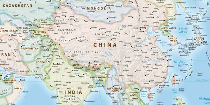 Because this is an equal-area map, less space was available for labeling features in Europe. Getting labels to fit in this area was challenging. Myriad Pro, in condensed and regular type, was used throughout.