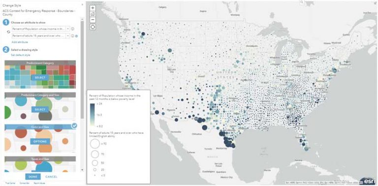 In general, percentages work well when mapping with color, but size is usually more appropriate to use when mapping a count such as the number of adults 18 years and over with limited English proficiency. Trying different styles helps you decide how to map this attribute.