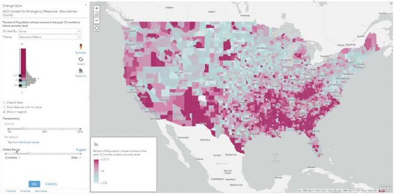 If you use the Above and Below theme on your map, it will adjust the colors to show which parts of the country are either above or below the average value for poverty for counties, which is 16 percent. This emphasizes areas of need, shown in orange.