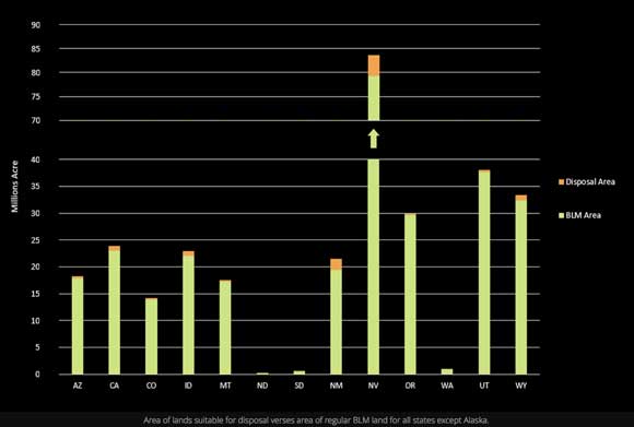 The team asked how much land potentially suitable for disposal exists in each state and how much of this disposal land exists for the entire United States. From interviews and correspondence with BLM staff, it was clear that only the western half of the United States has a significant amount of land that could be affected by the legislation. There is a BLM office for each of the 12 western states (except for the Montana/Dakotas office) and one office for the whole eastern part of the United States. Because it is still receiving its statehood and native settlement claims transfers, Alaska is a different story.