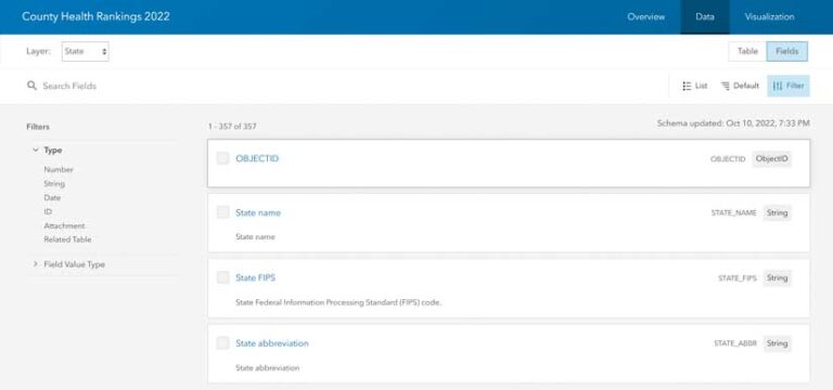 Some datasets are valuable in part because they bring together information from multiple sources. While it is very useful to have different types of information in one unified layer, it can raise questions about sources and vintages. However, the field description is an ideal place to store this type of attribute-specific metadata. For example, each year the Robert Wood Johnson Foundation undertakes the herculean task of combining several sources and updating each with the latest vintage data available to produce its County Health Rankings. This results in a very informative layer that provides attributes on topics such as obesity, smoking, child poverty, and mammogram screening.