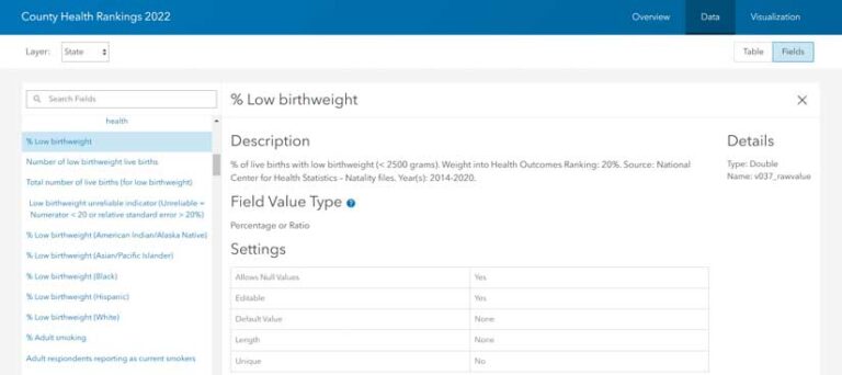 Hovering over the column exposes the field description, which includes source information. The source for data on low birth weight is the National Center for Health Statistics—Natality files for years 2014–2020. This field description also notes that low birth weight is defined as weight less than 2,500 grams, and that it’s 20 percent of the Health Outcomes ranking.
