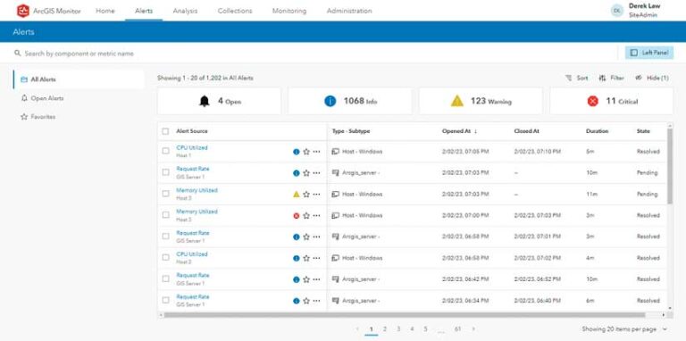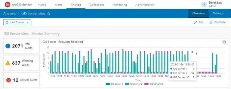 ArcGIS Monitor, a tool for holistic monitoring of ArcGIS Enterprise and its underlying infrastructure, collects data and information on an enterprise GIS deployment and provides managers and administrators with effective alerting and reporting.