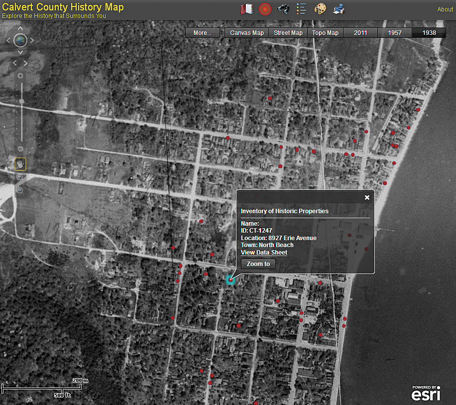 Compared to similarly sized counties, Calvert has an unusually large amount of aerial flyover imagery that goes back for decades. Its first aerial capture is almost 80 years old and was (figuratively) collecting dust until Eric Benson, another member of the GIS team, included it in its Historic Imagery viewer. Ten other captures taken in the intervening decades were also included as base layer options within the Flex-based viewer.