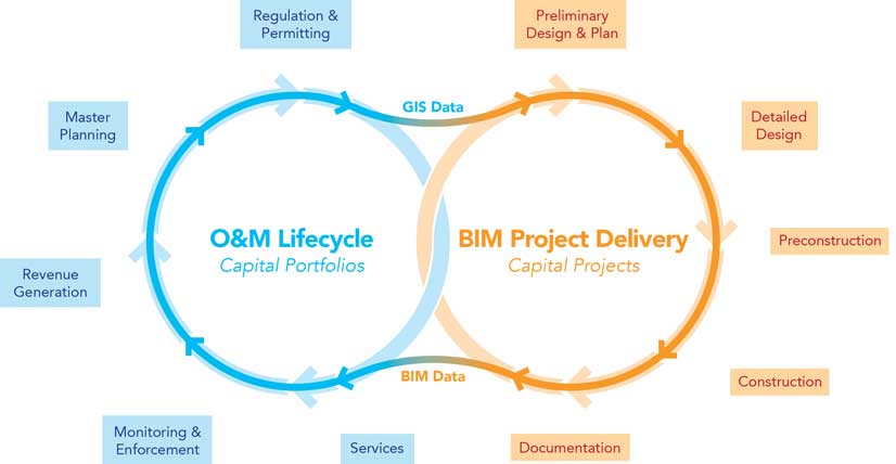 The traditional view of the life cycle of an asset is a sequential process. The asset is planned, designed, constructed, and then maintained. This process implies a tidy data handoff between steps, but this does not accurately represent how data flows through cities and organizations as they manage the creation, updating, and eventual decommissioning of buildings and infrastructure. A more accurate representation of the flow of data—one that is driving the integration of BIM and GIS—looks at how GIS and BIM data is used.