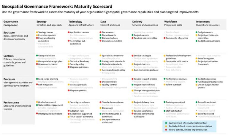 Governance is a complex and multilayered topic. It is too broad to be covered by a single article. However, the intention of this distilled Geospatial Governance Framework is to provide you with a starting point for establishing key components of your geospatial program’s governance model. Work through the framework systematically, and don’t be afraid to augment the framework by adding your own controls or processes.