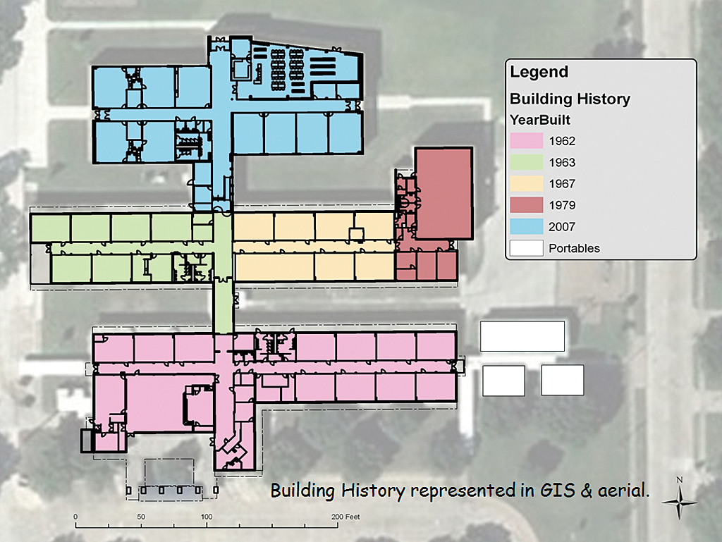 In addition, Walker uses Esri’s ModelBuilder to extract data from the AutoCAD drawings and create new layers in the geodatabase. “We apply structured queries to the polygons and annotations in AutoCAD to extract GIS feature classes from roof plan outlines and their related buildings,” said Walker. He used the same method on the construction history of both the original buildings and other structures that were subsequently attached to the original buildings. By doing this, he created about a half dozen new layers from the original AutoCAD files that could then be used to analyze the condition of district buildings.