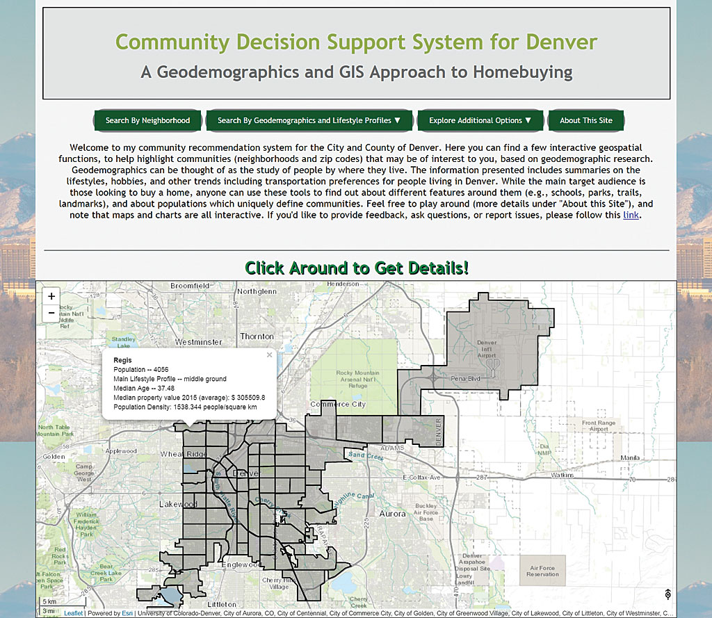 The author, a master’s student in geographic information science at the University of Denver, set out to develop a spatial decision support system for Denver that would help address these challenges by providing a variety of urban perspectives while maintaining a business-oriented approach. The system would be freely accessible via the web.
