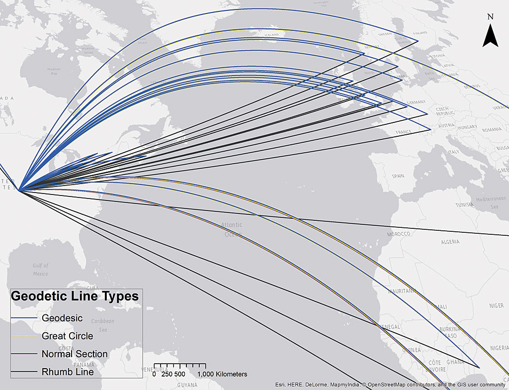 The geodesic line type, the default choice, is the most accurate for representing the shortest distance between two points on the earth’s surface, and the lines are visually appealing. As the objective was a map balancing a clean and appealing appearance with geographic accuracy, the geodesic line type was the winner.