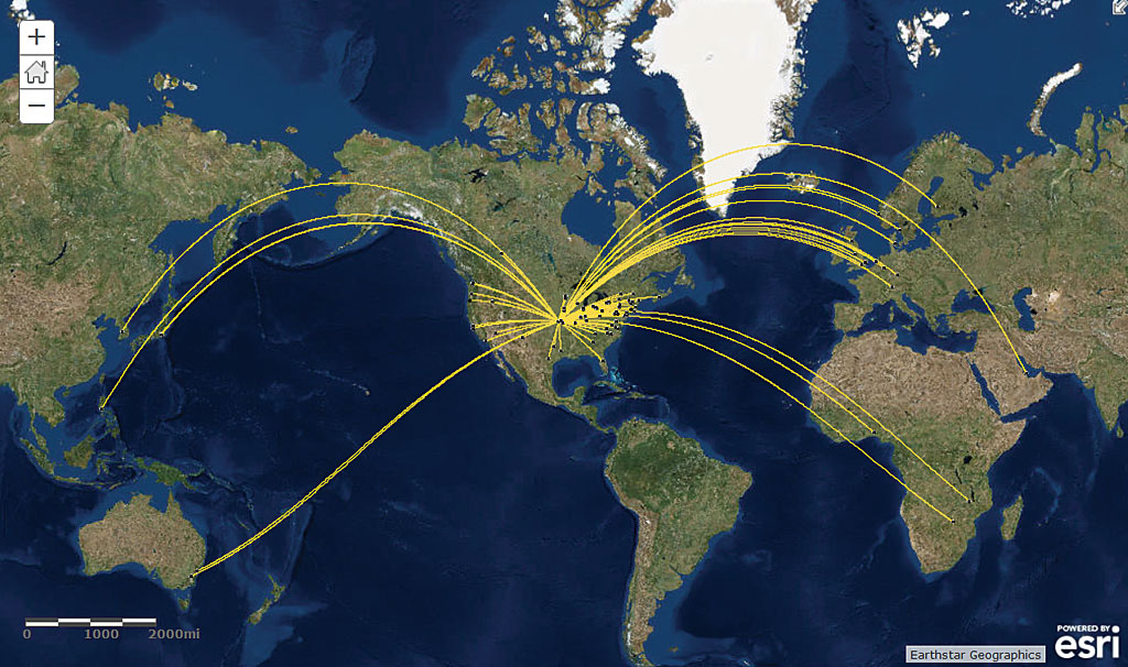 One splendid spring day in Lawrence, Kansas, GIS specialist Rhonda Houser was working as a colleague (her boss) was busy planning a big conference. For conference attendees, Houser had created a map of favorite local destinations. This was a straightforward process in ArcGIS Online that had a satisfactory result. Her colleague also asked if Houser could make a map showing where attendees had traveled from to attend the conference.