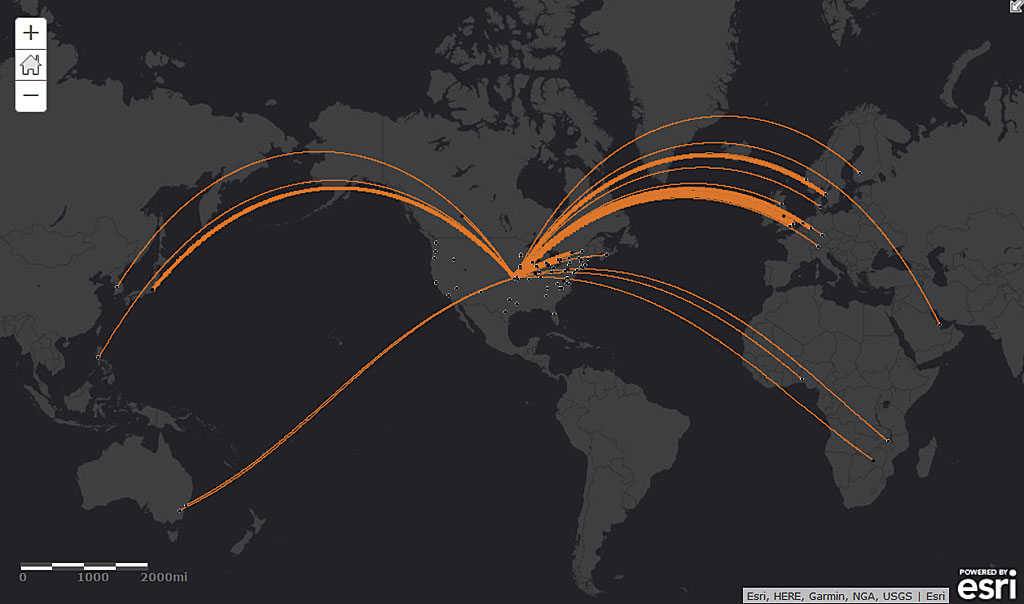 Houser found a helpful post on the ArcGIS Blog from September 6, 2011, “Creating radial flow maps with ArcGIS,” by Mamata Akella. It described how radial flow maps can show the movement of goods or people, using lines to depict transportation and communication routes and relationships. A radial flow map can show multiple origins converging on a single destination (or vice versa). Best of all, she learned that ArcGIS has a tool that generates radial flow data from geographic coordinates.