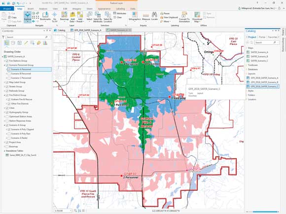 Now it’s your turn to create a Scenario C map using the same workflow described in this tutorial. You will update one map and one layout for Scenario C. Title this map: 8 Minute Travel—Scenario C, Optimal SAFER Staffing—19 Personnel Total. Update Text 2 to reflect that Station 96 staffing has four added personnel for a total of 19 responders.