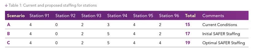 In the Contents pane, under the Scenario Personnel Group, turn on only Scenario A Personnel, and open its table. Scroll the table to the right and locate the Staff_SA field, which shows the 15 assigned personnel for the current deployment. Keep scrolling right and the Staff_SB field shows staffing for Scenario B, which adds two additional firefighters to Headquarters Station 94 for a total of 17 responders. The Staff_SC field shows staffing for Scenario C, which adds four additional firefighters to Station 96, giving a total of 19 responders. Table 1 summarizes current and proposed staffing for six stations.