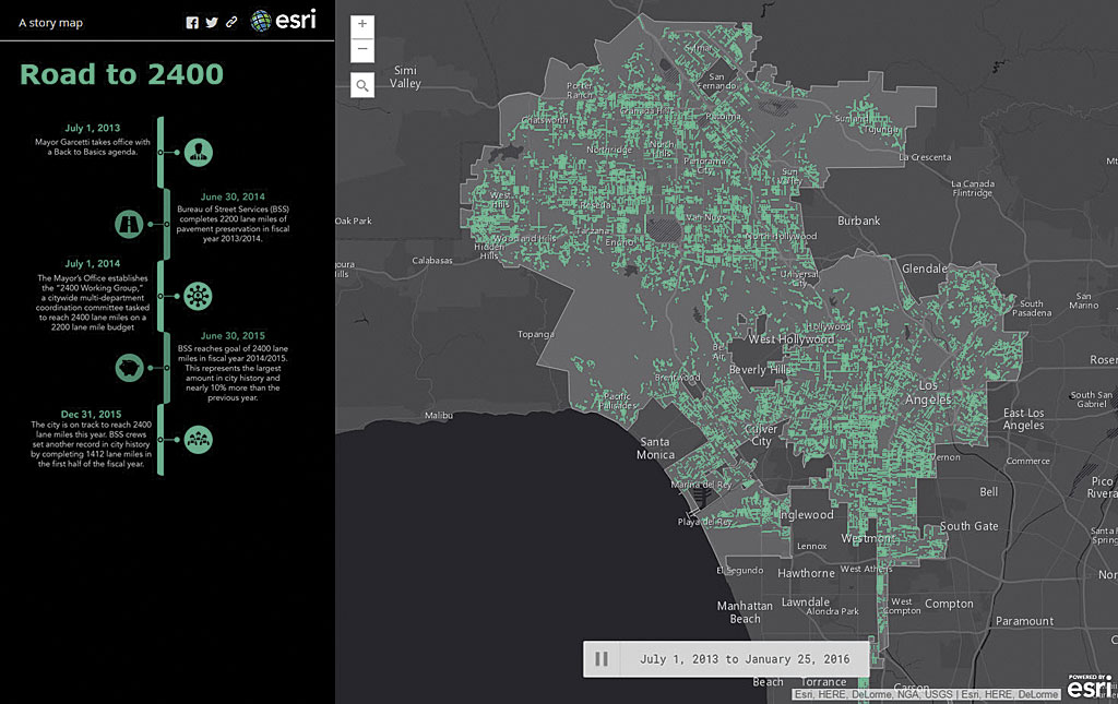 Some maps show how the city is reaching its goals. The Road to 2400 app displays the streets that have been paved since Garcetti took office in 2013 when he vowed to pave 2,400 lane miles of streets.