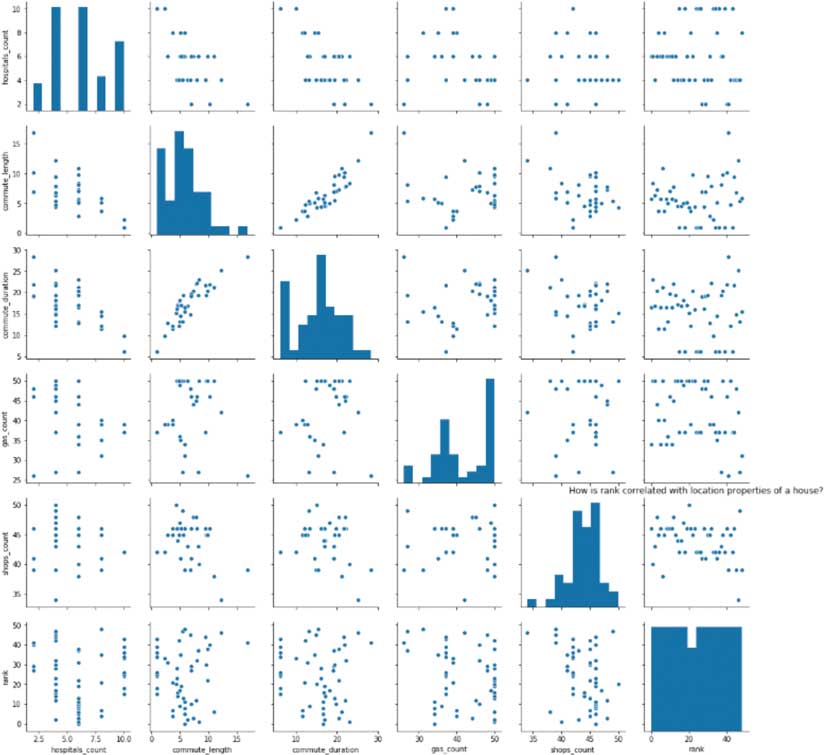 In the scatter grid, there is randomness and stratification in the rank variable, except (understandably) between commute_duration and commute_length. In a scatter grid showing rank and various intrinsic features of the properties, the scatter between rank and property price is quite random, meaning it is possible to buy a house with a higher rank for a lower than average price. The scatter between rank and square footage shows an interesting “U” shape, meaning that as property size increases, rank gets better, but after a certain point, it gets worse.
