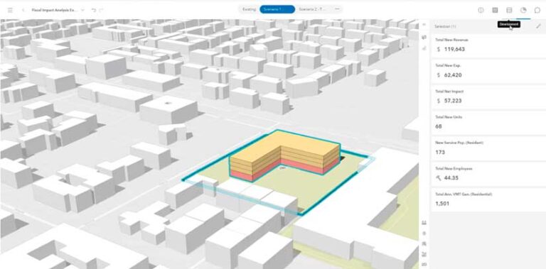 Empowering scenario planning and design—What would a redesigned building look like if it were changed to higher-density housing? What would be the fiscal impact of ensuring that 10, 20, or 30 percent of the housing is designated as affordable? What if the property is changed to mixed use? What are the potential new developments that could occur around this project? ArcGIS Urban enables digital transformation of city and regional planning.