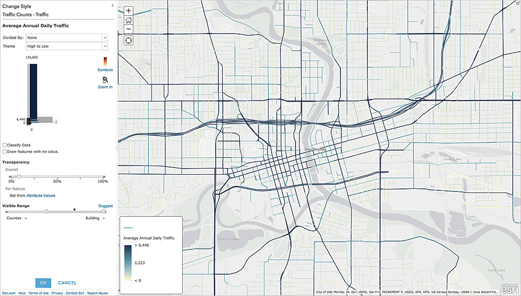 For example, if you were mapping annual average daily traffic on roads in the city of Des Moines, Iowa, the default High to Low theme would show roads with the most traffic using the darkest color in the ramp. Remember the first tip? Let’s put it into action and plan the map. We can select one of the many color ramp options to change the roads from the default blue to a brown.