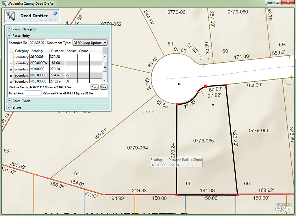 Enter a single parcel traverse in the Deed Drafter data entry grid using bearing and distance calls and then save it as a cadastral XML file that can be appended to a new parcel and incorporated in the Parcel Editor workflow. Deed Drafter is deployed using either ArcGIS for Server or an ArcGIS Online for Organizations account.
