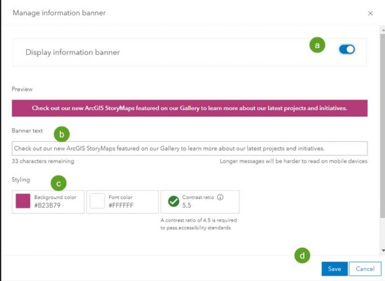 Information banner messages appear at the top and bottom of your site pages. The banner appears on the Home, Gallery, Map Viewer, Scene Viewer, Notebook, Groups, Content, and Organization pages. See my blog post “Configure your home page navigation bar and galleries” for more information.