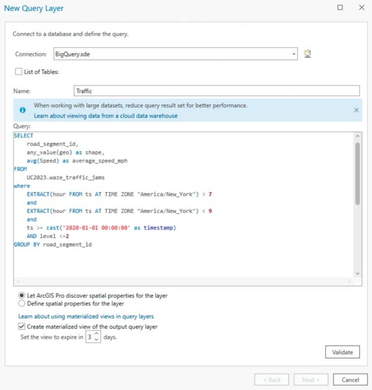 You can connect from ArcGIS Pro to three of the most widely adopted cloud data warehouses: Amazon Redshift, Google BigQuery, and Snowflake. Once a connection is established, you can create a new query layer (spatial) or a query table (nonspatial) to extract the features and attributes you want. For example, an analyst for a retail chain could create a query layer that aggregates sales information by product category and store location. Or a transportation organization could visualize where traffic congestion occurs during the morning rush hour.