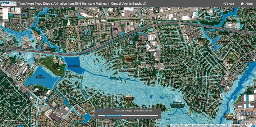 The flood impact of Hurricane Matthew was visualized using a dynamic series of flood layers in inland Virginia Beach, Virginia, driven by VIMS Street Level Hydrodynamic Model using 24 tiled flood rasters that were generated hourly on October 9, 2016, between 00:00–23:00 UTC.