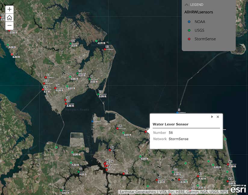 The project’s scope encompasses the interests of coastal local governments in Hampton Roads, Virginia, including the cities of Virginia Beach, Newport News, Norfolk, Chesapeake, Portsmouth, Hampton, Williamsburg, Poquoson, Suffolk, and York and Gloucester Counties. StormSense has installed or ingested existing sensors in these communities into its network.