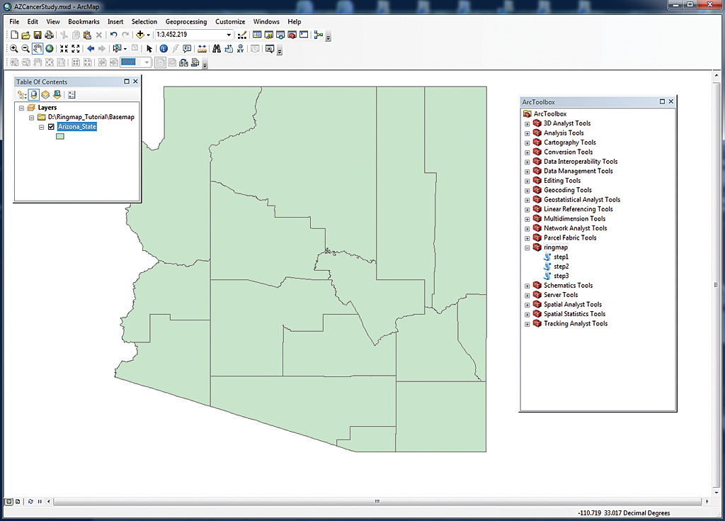 Start ArcMap and load the shapefile named Arizona_State.shp from the Basemap folder. Open ArcToolbox, right-click ArcToolbox in the ArcToolbox window, choose Add Toolbox, and select the toolbox named ringmap from the Ringmap_toolbox folder. The toolbox contains three scripts named step1, step2, and step3.