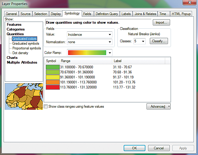 Double-click Arizona_Ringmap in the table of contents and choose the Symbology tab of the Properties dialog box. Choose Quantities > Graduated colors and set the number of classes to five and method to Quantile. Edit labels and apply a color ramp to symbolize female breast cancer incidence in Arizona for 2006–2010. The inner ring displays data from 2006, and the outer ring displays data from 2010. Apply county name labels and a pleasing color to Arizona_State.