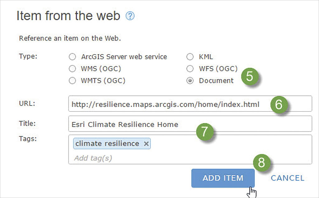 - Click ADD ITEM. Complete the item summary and description, add a thumbnail, and most important, Share publicly.