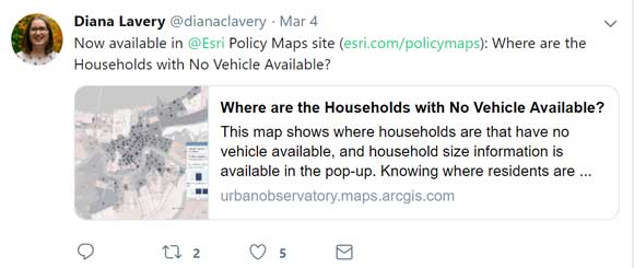 Those who use your item will thank you! A complete Details page for every item not only makes your work easy to find, understand, and use by others but it also makes your item more credible. And it’s required when nominating an item for inclusion in ArcGIS Living Atlas of the World and it makes your web map social media ready. For example, when I shared a map entitled “Where Are the Households with No Vehicles Available” on Twitter, the title, image, and blurb right from my Details page were picked up by Twitter.